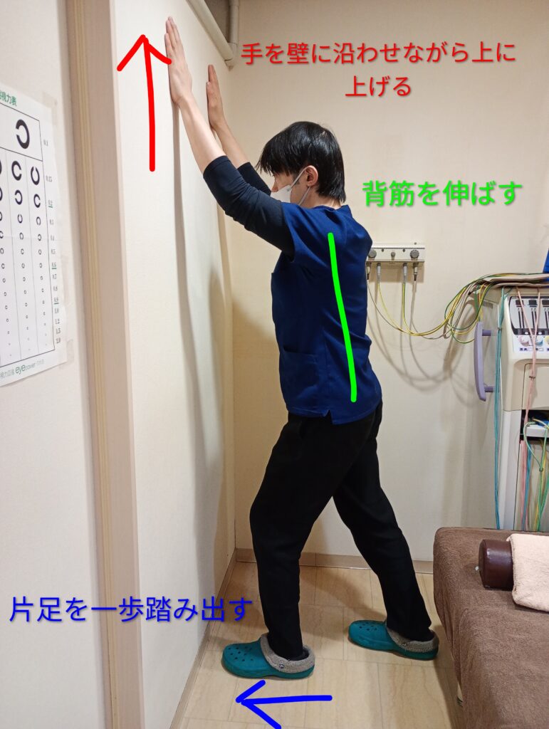壁に向かって立ち、バンザイするように両手を上げて手のひらを壁につけます。できるだけ手を上げたら壁に一歩近づき、手を壁に添わせながら手を少しずつ上に上げていきます。