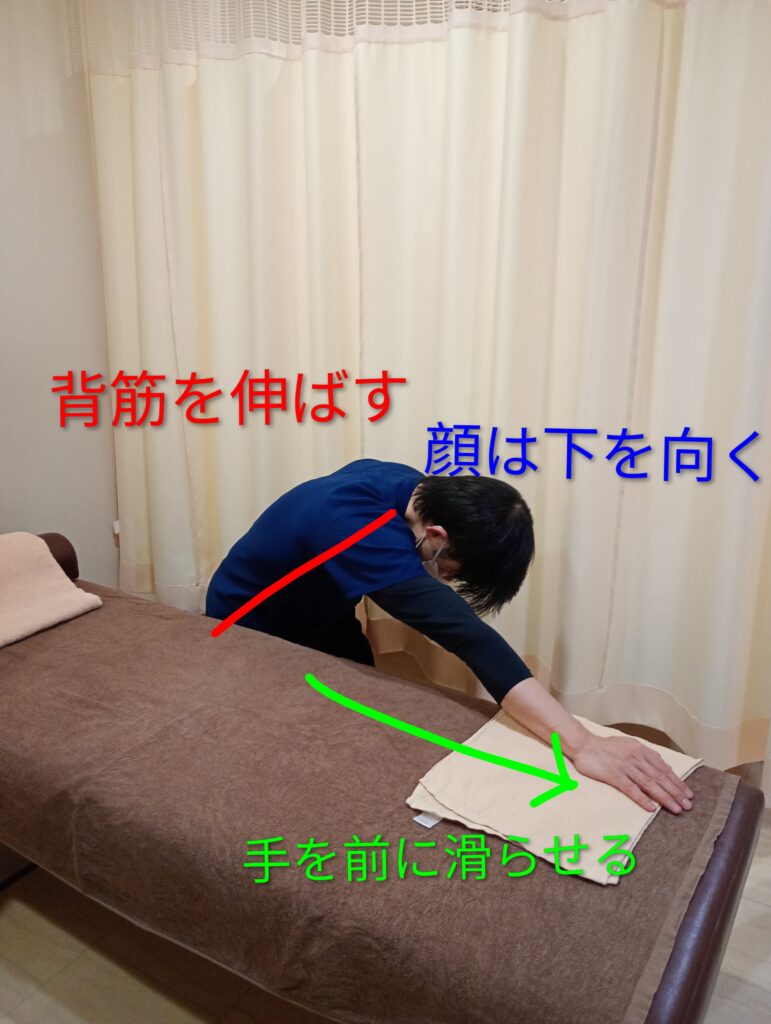 できる範囲で伸ばしきったら、布巾を滑らせながら元の姿勢に戻ります。